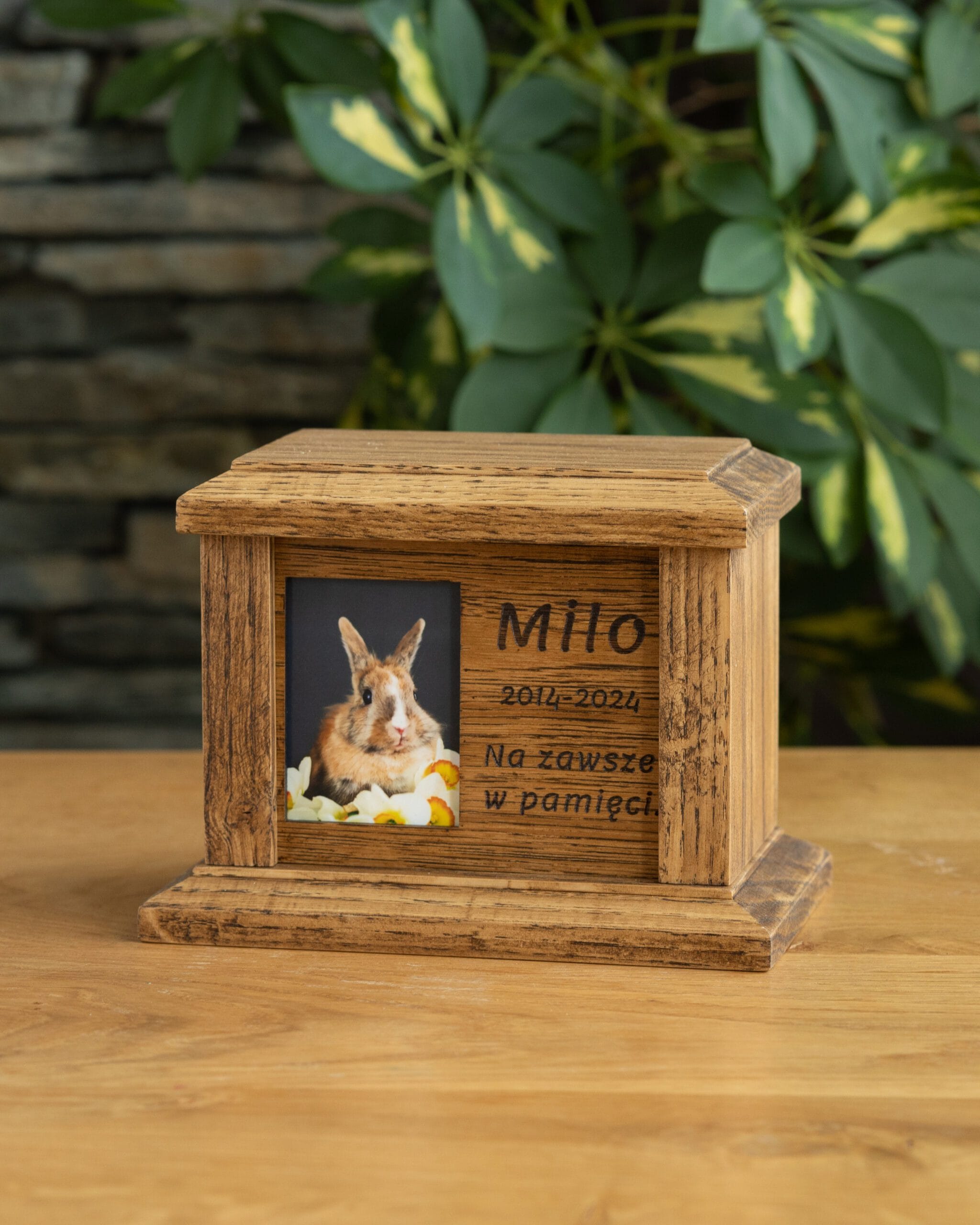 Mimo że zdjęcie umieszczasz samodzielnie, napisy grawerujemy my. Imię Twojego psa, daty oraz sentencja zostaną wypalone laserem w drewnie pod zdjęciem. Przed wykonaniem wyślemy Ci projekt napisów do akceptacji.